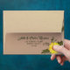 Elevate your wedding correspondence with our elegant 5x7 envelope, blending modern and country boho styles. Adorned in rose gold and burgundy, it features a return address, rustic barn wood interior, sunflowers, and string lights, creating a chic and inviting touch.