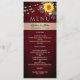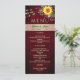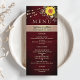 Elevate your fall wedding reception with this rustic wood burgundy wedding menu, blending modern elegance with rustic charm. Designed on rich burgundy paper with a wood-textured look, it features vibrant sunflowers, delicate gold gilded floral lace, and the soft glow of string lights. Perfect for barn, outdoor, or autumn celebrations, this menu adds warmth and romance to your tablescape. Personalize with your wedding meal details to create an unforgettable dining experience your guests will love.