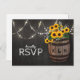 Stylish country wedding rsvp postcards featuring a rustic black chalkboard backdrop, string twinkle lights, summer golden yellow sunflowers, a winery wooden barrel wiith your initials and a piece of knotted string.