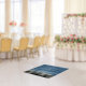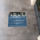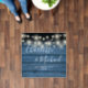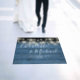Elegant wedding floor decal personalized with signature style names and your special wedding date on a rustic blue wood and string lights background. Designed by Thisisnotme©
