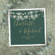 Featuring pretty string lights and signature style names, these elegant emerald green and gold napkins can be personalized with your wedding details in chic lettering. Designed by Thisisnotme©