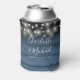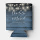 An elegant wedding favor can cooler featuring pretty string lights, stylish signature script names and special date on a blue rustic wood background. Designed by Thisisnotme©