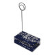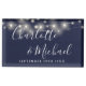 Elegant navy blue place card holder featuring pretty string lights and personalized with signature style names and your special date. Designed by Thisisnotme©