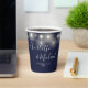 Elegant navy blue wedding paper cup featuring pretty string lights, signature style names and your special wedding date. Designed by Thisisnotme©