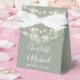 Elegant sage green wedding favor box featuring pretty string lights, stylish signature script names and special date set in modern typography. You can personalize with your own thank you message under the lid. A perfect way to say thank you to your guests! Designed by Thisisnotme©