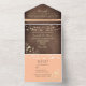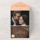 Elegant, boho, modern, chic peach fuzz and rustic wood wedding all-in-one invitation with faux gold floral lace, string lights and custom picture of the couple at the back.