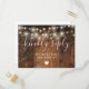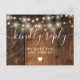 A string lights rustic wood barn boho RSVP card with chic typography. The reverse features your details and a fun guest song request. Designed by Thisisnotme©