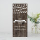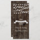 String of lights and vintage banner on old wood summer wedding menu card featuring a white banner with brown outline on old brown wood background. This modern and trendy wooden wedding design with vintage elements is part of a wedding set or collection, is fully customizable and is perfect for an outdoor summer night barn western rustic wedding. Note that there is not real wood just printed images.