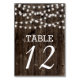 String of lights on old wood summer wedding table number featuring white twinkle glowing string of lights on the top on old brown wood background. This modern and trendy wooden wedding design is part of a wedding set or collection, is fully customizable and is perfect for an outdoor summer night barn western rustic wedding. Note that there is not real wood just printed images.