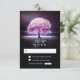 purple rustic wedding RSVP card with old oak tree and string lights.