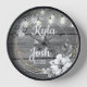 On this stylish wedding pickleball paddle is a grey rustic wood backdrop is a chic floral wreath where you can customize it and above that is a string of lights creating farmhouse romantic elegance. Part of the Stylish Trendy Wedding Gifts Collection