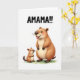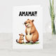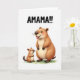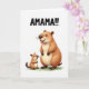 This greeting card shows two chubby, friendly, rodent-like characters standing close together on a wide white background, their body language suggesting a sweet bond ❤️. The larger one has warm brown fur with a creamy belly, dark shiny eyes, rosy cheeks, and a tiny pink tongue showing as it looks ahead with a teasing, affectionate expression. Beside it, a smaller companion tilts its head up toward the larger one, wearing the same soft blush and an admiring gaze that reads like close friendship. A narrow, painterly strip of green beneath their feet hints at grass and adds a gentle outdoor touch without filling the background. Near the top of the card, the text “AMAMA!!” appears in large uppercase letters, set in a dark tone that stands out clearly against the white space. The letters sit centered above the characters, leaving plenty of open room between the headline and their ears for an airy layout 🌼. Subtle shading and smooth color transitions give the fur a plush look, especially along the rounded cheeks and bellies. The green ground is brushed in uneven strokes, with lighter and darker patches that fade softly at the edges.