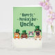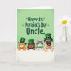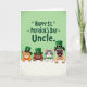 Designed with four friendly, human-like pets peeking over a bright white ledge, this St. Patrick’s Day card sets a sweet, buddy-to-buddy scene. Behind them, a softly blended green background frames their faces as they lean in close, their paws resting side by side like they’re sharing a private greeting. Two cats and two dogs wear small emerald top hats with gold buckles, and one striped cat adds a green bow tie that makes it look extra attentive. Their expressions feel affectionate and welcoming, with bright eyes and open smiles that suggest they’re all in on the same cheerful surprise for someone special. Near the top, the message “HAPPY ST. PATRICK’S DAY Uncle” appears in large, easy-to-read lettering, with small shamrock accents sprinkled around it ☘️💚. The text stands out clearly against the green backdrop, keeping the focus on the greeting while leaving plenty of room for the characters’ faces. One cat has warm orange fur, another shows darker stripes, and the dogs include a smooth brown coat and a lighter fawn face with gentle wrinkles under the hat. Tiny shamrocks dot the green background above the characters, while the white foreground stays plain and crisp.