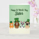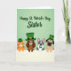 Designed with a soft light-green gradient filling the top portion, this St. Patrick’s Day card sets a sweet, friendly tone with a gentle holiday greeting centered near the top in flowing green lettering 💚. Beneath the text, four cozy animal friends lean over a wide white horizontal edge, their faces close together as if sharing a quiet joke. On the left, a striped orange cat wears a small green bowler hat, tilting slightly toward the group in a companionable pose. Next is a brown long-eared dog in a tall green top hat with a gold buckle, angled forward like it’s eager to join the conversation. A gray-and-white dog with alert ears and a green bow tie stands in the middle, looking calmly ahead as though keeping everyone together. On the right, a fawn-colored dog with a flattened snout and wide eyes wears a tiny green top hat, its gaze turned toward the others with an affectionate, friendly look ☘️. The white band runs straight across the lower section, with the four heads and hats peeking just above it against the pale green background.