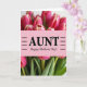 This card features a lush bouquet filling the top and bottom, with fuchsia and blush-pink flowers that look softly unfurled, like they’re leaning in close with affectionate warmth ❤️. Deep emerald-green leaves and stems weave between the blooms, giving the arrangement a grounded, garden-fresh feel. Across the center runs a horizontal band of gentle rose-pink, creating a calm pause between the floral clusters. In the middle of that band, the word “AUNT” appears in large black serif letters, with thin line accents on either side for a tidy, balanced look. Just beneath it, “Happy Mother’s Day!” is written in a flowing black cursive style, smaller and friendlier, like a quiet note tucked into the flowers 🌼. The surrounding petals are slightly softened and blurred compared to the center, drawing your eyes toward the text as if the bouquet is framing it with care. The lighting stays soft and diffused, making the pink tones shift from rich fuchsia to pale blush while the rose-pink band remains smooth and even.