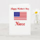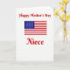 This greeting card features a wide white background that lets a few carefully placed elements speak softly but clearly. Near the top, a congratulatory line sits centered in flowing red lettering, setting a warm, affectionate tone ❤️. In the middle, a rectangular flag-style banner stretches across the card, like a shared keepsake between close family or friends. The banner shows horizontal red and white stripes, with a dark blue rectangle in the upper-left corner filled with small white five-point stars. At the bottom, a short family title appears centered in the same red lettering as the top line, creating a gentle visual echo. The spacing feels balanced from top to bottom, giving the design a calm, respectful look while still feeling close and caring 🌼. The stars are evenly scattered across the blue corner, and the red text stands out sharply against the open white space.