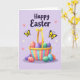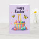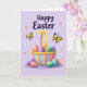 This greeting card shows a striped basket made of soft pink, teal, orange, and yellow sections, topped with a golden ribbon that catches the light. Around the basket, several egg shapes are decorated with neat horizontal stripes in lilac, mint green, sky blue, and coral, clustered close like friends leaning in for a photo 🐰. The lighting is gentle and diffused, giving the basket and eggs a smooth, glossy look that feels tender and calm. Two small winged insects in bright yellow with dark outlines hover near the top, angled toward each other as if sharing a secret 🐇. Near the upper area, a festive greeting is placed in flowing lettering, set in a deep tone that stands out against the background. The backdrop is a soft lavender field with tiny glowing starbursts sprinkled around, adding a dreamy sparkle without crowding the scene. Small blush-colored egg accents dot the space, echoing the main shapes and guiding your eye back toward the basket. The golden ribbon sits centered on the basket’s rim, with highlights along its loops and tails.