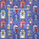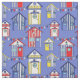 Sky blue fabric printed with a hand drawn pattern of cute striped beach huts in red, white, yellow and blue