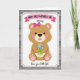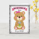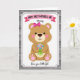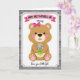 Designed with a sweet, stylized bear-like figure centered on a white background, this illustration uses warm browns and gentle pink accents to set a cozy, affectionate tone ❤️. The character has wide eyes and a soft smile, holding a small bouquet of wildflowers close to its chest as if offering it to someone special. The flowers mix pastel shades with brighter pinks, blues, and yellows, creating a cheerful contrast against the brown fur. Across the top, a pink banner stretches from side to side with a short congratulatory line in darker lettering placed neatly in the middle. Near the bottom, a smaller line of text sits below the character in a lighter, flowing style, leaving plenty of white space around it. A softly scalloped white frame outlines the scene, and behind it sits a lightly textured wooden surface with horizontal grain, adding a homey backdrop 🌼. The bear wears a bright pink bow on its head, with rosy paw pads visible as it hugs the bouquet.