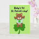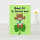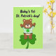 This card shows a cute brown teddy bear standing on a large green shamrock against a bright lime-green background ☘️. The bear wears a white-and-green striped shirt with a small shamrock centered on its chest, tying the theme together in a simple, sweet way. With a wide smile and both arms lifted, it looks like it’s reaching out for a hug, giving the scene a friendly, affectionate feel 💚. The lighting stays soft and even, so the bear and shamrock look smooth and gentle without strong shadows. Near the top, the text reads “Baby’s 1st St. Patrick’s day!” and sits above the bear to frame the main image. The lettering is in a darker green that stands out clearly from the lighter background. The shamrock beneath the bear is oversized and rounded, with three full leaves spreading out under its feet.