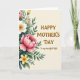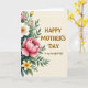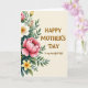 Designed with a soft, creamy background, this card features a flowing arrangement of flowers and greenery sweeping along the left side and curling across the bottom edge. A large pink peony sits near the center, its layered petals and deeper-toned core drawing the eye like a gentle embrace ❤️. Around it, small white blooms with sunny yellow centers, tiny golden florets, and a few budding stems nestle among deep green leaves, creating the look of a garden gathered with care. The lighting feels lightly diffused, giving the petals a tender glow and making the bouquet seem quietly affectionate. On the right side, the words “HAPPY MOTHER’S DAY” appear in textured gold lettering, standing out clearly against the pale background. Beneath that, “To my beautiful Wife” is placed in smaller, flowing gold text, adding an intimate, close-to-the-heart note 👩. The floral cascade frames the lower edge with scattered buds and leaves, while the right side stays open and airy around the gold message.