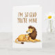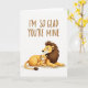 This card shows two large cats sharing a quiet, close moment on a white background, their bodies tucked together in a way that reads like family love or lifelong friendship ❤️. Across the upper portion, the text “I’M SO GLAD YOU’RE MINE” sits centered in a warm sepia tone with a casual handwritten look. Below the words, an adult cat with a full, dark mane lies resting, eyes closed, wearing a calm expression as if enjoying the other’s company. Nestled against it is a smaller, younger cat, leaning in with the same closed-eyed ease, suggesting trust through their gentle contact. Their fur is shaded in golden ochres and deep umbers, with soft lighting that smooths the edges and keeps the scene tender rather than dramatic. A faint rosy blush on their cheeks adds a sweet, human-like touch, like they’re sharing a private, affectionate pause 🌼. The two figures are rounded and softly highlighted, with the mane flowing in dark strokes around the adult cat’s face and neck.