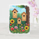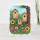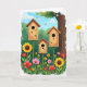 This design shows a sunny garden scene with three wooden birdhouses in different heights, each on a slim, bamboo-like pole and each with a dark round entry that feels inviting. Behind them, leafy green plants fill the background under a clear blue sky where soft white clouds drift, giving the whole view an easy, open-air calm. Small textured accents in assorted colors decorate the birdhouses, like little notes of affection tucked onto the wood ❤️. A tall tree trunk rises on the right side, adding a steady, protective presence as if watching over the cozy homes. Along the bottom, a thick spread of flowers blooms in layers, including big yellow blossoms with dark centers, red poppy-like flowers, and gentle pink petals mixed with smaller yellow and red blooms 🌼. Two tiny winged insects float near the birdhouses, their paths crossing like quiet companions meeting midair. There is no text on the front, and the artwork keeps the focus on the rich greens, warm wood tones, and the bright sky with scattered clouds above the flower-filled foreground.
