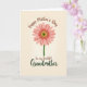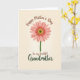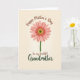 This greeting card features a soft, creamy background that feels like warm morning light, with a single large flower centered to draw the eye ❤️. The bloom opens in coral-pink tones that fade from pale edges into a deeper shade toward the middle, like a gentle blush. Its center is ringed with golden-yellow details around a fresh green core, giving it a lively, affectionate focus. A slim deep-green stem drops straight down, keeping the composition calm and steady. Across the top, curved cursive-style lettering in earthy maroon sits like an arch over the flower, adding a graceful, celebratory touch. Near the bottom, larger flowing cursive-style text in forest green rests beneath the stem, reading as a warm dedication, with the careful spacing suggesting closeness and care 🌼. The flower’s petals show soft shading, the yellow ring is finely dotted, and the green center sits like a small round jewel against the creamy backdrop.