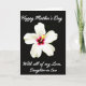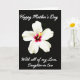This card features a glowing white flower centered on a deep black background, creating a striking contrast that draws your eye in right away. The bloom has many wide, gently rippling petals with soft-looking texture, like velvet under low light. At the center, a rich crimson-magenta glow melts into warm pink and then fades into the surrounding white, giving the flower a tender, affectionate warmth ❤️. A golden-yellow stamen rises from that colorful core, with tiny red tips that feel like a small, intimate detail meant to be noticed up close. Near the top, the message “Happy Mother’s Day” appears in thin white lettering, floating above the flower without touching it. Near the bottom, “With all of my Love, Daughter-in Law” is also set in white, balanced beneath the bloom like a quiet sign-off 🌼. The black background stays unbroken from edge to edge, making the white petals and the bright center look even more luminous.