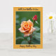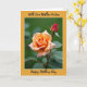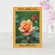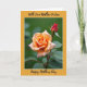 The front design shows a botanical portrait framed in golden-orange with a thin white inner border, setting a cozy, affectionate tone ❤️. In the center, two flowers sit against a softly blurred background of leafy greens, as if leaning toward each other like close friends. At the lower left, a fully open bloom spreads many layered petals that fade from creamy peach at the edges into warm apricot near the curled center. Above and slightly right, a tightly closed deep-red bud stands upright, offering a sweet contrast that feels like a quiet promise beside the open flower. Soft, gentle lighting smooths the scene and highlights the velvety petal texture and fresh green leaves without any harsh shadows. A short line of text sits near the top in a dark, flowing style, and another line rests near the bottom in the same color, both centered within the frame 🌼. The background melts into a green haze while the orange border stays crisp, with the white inner line tracing the frame evenly all around.