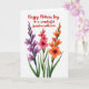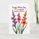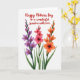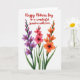 This card features a bright floral scene on a white background, with three tall columns of painted blossoms rising like a garden bouquet. On the left, slim green stems hold small purple flowers with tiny golden-orange centers, leaning gently as if reaching toward the middle. The center column shows coral-pink blooms that deepen into rich magenta near the heart of each flower, giving the arrangement a cozy, affectionate feel ❤️. On the right, warm orange blossoms glow with deeper brown tones in their centers, echoing the warmth of a close hug. Thin leaves, buds, and soft green accents weave between the flowers, adding a calm, natural rhythm. Near the top, a flowing red message reads “Happy Mother’s Day to a wonderful grandma with love,” centered above the flowers in a single line. The red lettering sits clearly against the white space, while the three vertical flower groupings—purple on the left, coral in the middle, and orange on the right—stand evenly spaced beneath it 🌼.