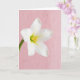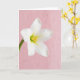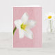 This design shows a single white flower with six smooth petals opening gently, placed slightly left of center as if leaning in with quiet affection ❤️. A slim green stem rises from the lower left and curves upward, giving the bloom a graceful, almost companionable posture against the background. The backdrop is a soft pink field with faint vertical stripes that resemble lightly ridged paper, keeping the scene calm and intimate. Soft, diffused light makes the petals look velvety and slightly translucent, like a tender touch captured in stillness. Near the middle, a warm cluster of yellow anthers sits inside a green-yellow throat, adding a small spark of closeness and warmth 🌼. There is no large headline across the top, and any wording would sit best on the open right side in a small, simple font, using a deeper pink or muted gray for contrast. The pollen appears lightly dusted, adding fine texture without crowding the airy composition. The pink background’s vertical striations remain subtle behind the off-center bloom and its curved green stem.