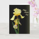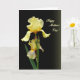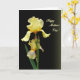 Designed with two layered blossoms as the focus, the card shows a tender floral pairing that feels like a gentle nod between close friends ❤️. The background fades from deep black into a shadowy olive tone, giving the flowers a soft glow and a quiet, intimate mood. Near the top, a large butter-yellow bloom opens wide with ruffled petals that look lightly lit from within. Below it sits a smaller flower partway open, accompanied by a tight bud, as if the trio is leaning toward one another in a calm, caring cluster. A green stem rises from the lower area, with slim leaves reaching up from the lower left to balance the composition. In the upper right, the words “Happy Mother’s Day!” appear in golden lettering, standing out clearly against the dark gradient 🌼. The lower petals show fine reddish-brown lines and shading that trace across the pale yellow, adding depth and a hand-drawn texture. Share Mother’s Day sentiments with someone special.