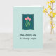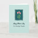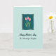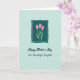This card features a calm pale aqua background with lots of open space, setting a gentle, caring tone ❤️. Near the upper middle, three soft pink blossoms that resemble young tulips rise together from a deep teal rectangle, like a small garden scene held close. Their stems are slim and green with a few simple leaf shapes, and the flowers lean slightly toward one another, suggesting a close bond like friends sharing a quiet moment. The teal rectangle is edged by a thin rosy-pink border that looks slightly uneven, giving the frame a cozy, drawn-by-hand feel. Below the floral frame, two lines of dark charcoal lettering sit centered on the page, with “Happy Mother’s Day” on the first line and “To a Wonderful Daughter” beneath it. The text is smooth and flowing, and it balances the picture above without crowding it, leaving the design airy and tender 🌼. The pink border around the teal frame has small, gentle wavers along its edges.