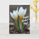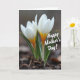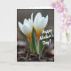 On the front of the card is a close-up nature scene featuring two small, newly opened flowers rising from dark, textured soil, their white petals gently unfolding as if leaning toward each other in quiet companionship ❤️. At the center of each bloom, a warm yellow-orange core glows against the cooler white edges, creating a soft contrast that feels tender and intimate. Slender green leaves with faint vertical striping curl upward around the stems, loosely framing the blossoms like a protective embrace. The background fades into a smooth blur, keeping attention on the pair and giving the scene a calm, private mood. Diffused light washes over the petals, making them look slightly translucent and delicate, as though the flowers are sharing a secret moment. A short celebratory message appears over the image in white lettering, placed across the upper area so it floats lightly above the blooms 🌼. Small bits of organic texture and scattered fragments are visible in the foreground soil beneath the stems.