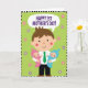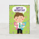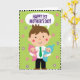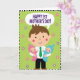 This card features a kind-faced adult figure at the center, dressed in a neat outfit with a bright green necktie, smiling softly with rosy cheeks as if sharing a quiet, loving moment ❤️. In each arm, the adult cuddles a happy infant—one in gentle pink and the other in calm blue—both grinning back with a cozy, close-to-the-cheek warmth that reads like family affection. The trio is arranged in a balanced, symmetrical way, making their closeness the main focus and giving the scene a steady, caring feel. Behind them is a lime-green background sprinkled with small, stylized blossoms in light pink and lavender, adding a springtime touch 🌼. Near the top, a speech bubble floats above the adult’s head, carrying a congratulatory message. The message sits centered inside the bubble in purple lettering, standing out clearly against the light interior. A black-and-white striped border frames the entire illustration, creating a crisp graphic edge around the green field and scattered flowers. The adult and babies are drawn with simple shapes and smooth color fills, with the blossoms dotting the background like confetti.