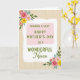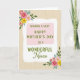 This card features a softly wavy white frame like light parchment, set over a pale, vertical wood-grain background that feels calm and natural. Inside the frame, the main message sits centered in deep leafy green, drawing the eye without feeling loud. Key words appear in a simple, thick letter style, then shift into a smooth, flowing cursive line for the closing words, adding a tender, close-to-you tone ❤️. At the top-left corner, a floral cluster leans inward as if offering a gentle hello, with fuchsia and blush-pink petals tucked among green leaves and small turquoise touches. A matching cluster blooms at the bottom-right, where sunny yellow flowers brighten the corner like a friendly nod 🌼. The overall layout leaves comfortable breathing room around the text, so the flowers feel like affectionate companions rather than decorations fighting for attention. The green lettering stays within the white frame, while the blossoms slightly overlap its edge to create a soft layered look. The pale wood background runs in narrow vertical lines behind everything, with the white frame floating neatly in the center.