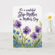 This card features a soft digital illustration with flowing lettering across the upper portion, set in a deep purple tone that feels gently romantic ❤️. Beneath the text, a garden-like spread of flowers rises from the bottom edge, like a shared stroll through a quiet spring patch. Several large blossoms take center stage with velvety purple petals and sunny yellow centers, leaning toward one another in a tender, companionable way. Around them, smaller sky-blue flowers with yellow middles fill in the space, adding a light, friendly sparkle 🌼. Slender green stems and leaves climb upward in a loose watercolor style, creating a natural base that frames the message without crowding it. The background fades in creamy yellow with hints of muted sage, like morning light filtering through a calm yard. The lettering sits clearly above the floral cluster, while the purple and blue blooms gather thickest along the lower half against the softly washed backdrop.