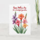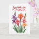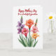 This card features a clustered bouquet of mixed flowers on a bright white background, arranged closely as if they’re leaning toward one another in a friendly embrace ❤️. Petals range from deep violet and lively coral to blush pink and soft apricot, with gentle shading that gives them a softly painted look. Small yellow centers glow in each open bloom, adding a sunny contrast that draws your eye inward. Slender green stems lift the flowers upward, while a few closed buds sit nearby like quiet companions waiting their turn to open 🌼. Long, smooth leaves spread out around the base to frame the bouquet and keep the composition balanced. Near the top, a flowing line of text appears in deep red, centered above the flowers and spaced to feel airy against the white space. The lettering curves lightly, echoing the natural arcs of the stems below. The bouquet sits in the lower half of the design, with the tallest blossoms reaching up toward the red text.