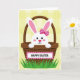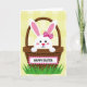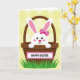 This card shows a white bunny peeking out of a sturdy brown woven basket, its big dark eyes and rosy cheeks giving it a sweet, friendly look 🐰. A pink, heart-shaped nose and a small smile add to the tender expression, like it’s greeting someone special just out of view. A pink-and-white striped bow sits near one ear, softening the look with a gentle, affectionate touch. The basket rests on bright green grass that feels like a sunny outdoor moment in early spring 🌷. Behind everything is a pale yellow backdrop with a faint checkered pattern that keeps the scene light and cozy. On the front of the basket, a banner with a scalloped pink border holds the seasonal greeting in dark lettering, centered and easy to read. The colors stay mostly pastel, with the pink accents drawing your eye back to the bunny’s face and the message. The basket’s weave is shown with subtle texture lines, and the banner lies flat across its front.