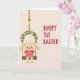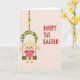 Designed with a sweet spring scene, the illustration centers on a cute rabbit-like character with long gentle ears and rosy cheeks, sitting on a simple wooden swing 🐰. The character’s soft sideways glance and relaxed posture suggest a tender, friendly moment, like it’s waiting for someone special to join in. It wears a horizontally striped top in pale pink and muted red, keeping the look light and cozy. Above, an arch of green leaves dotted with small daisy-like flowers in white and yellow hangs like a garden garland 🌷. The swing ropes rise to a decorative knot, accented by a single yellow flower that draws the eye upward. On the right side, the words “HAPPY 1st EASTER” appear in red lettering, stacked neatly to balance the character on the left. Behind everything, the background is muted peach with a faint grid pattern that adds gentle texture.