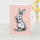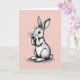 This card features a cute, humanlike long-eared bunny 🐰 sitting in the center against a pastel pink background with soft diagonal stripes. Rendered mostly in gentle greys, the bunny’s tall ears stand alert while its fluffy tail peeks out behind, giving it a sweet, bashful presence. It sits with its little front paws held over its mouth, like it’s hiding a giggle shared with someone close or reacting to a tender surprise. Subtle shading and fine linework suggest soft fur, delicate whiskers, and rounded contours that make the character feel touchable. Large reddish-brown eyes look outward with a warm, inviting gaze, as if meeting a friend’s eyes across the room 🌷. There’s no visible text on the front, leaving the illustration to carry the message on its own. A faint shadow beneath its feet anchors the bunny against the flat pink field with diagonal stripes.