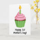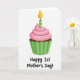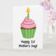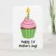 This Mother's Day card features a single cupcake centered on a wide white background, giving it an airy, gallery-like look. The cupcake has a deep brown base tucked into a fluted green wrapper, like it’s been set out just for a sweet shared moment ❤️. On top sits a smooth swirl of soft pink frosting, rounded and glossy, adding a gentle, affectionate feel to the scene. A slim candle rises from the frosting with vertical stripes in two shades of green, as if marking a small but cherished first celebration. Its teardrop flame glows yellow-orange, suggesting warmth and closeness without needing anything else in the setting 🌼. Beneath the cupcake, the text “Happy 1st Mother’s Day!” appears centered in casual hand-drawn lettering, printed in black for strong contrast. The candle’s striped body is bright and lime green, standing straight up from the pink frosting.