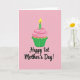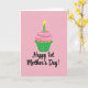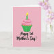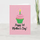 This card shows a single cupcake centered near the top, drawn with smooth, rounded shapes that feel sweet and inviting ❤️. The cake base is a warm golden tone, sitting in a pleated green wrapper, and it’s topped with a soft swirl of pale pink frosting. A slim green candle with light stripes rises from the frosting, and its small flame glows in yellow and orange like a tiny shared moment between close friends. The background is an even blush pink, giving the scene a gentle, affectionate setting that reads like a quiet celebration. Beneath the cupcake, the main message is placed across the lower half in flowing black lettering, standing out clearly against the pink. The wording includes “1st,” with the rest of the phrase arranged on the same line so it reads quickly at a glance, like a warm note left on a kitchen counter 🌼. The candle sits slightly off-center above the frosting, and the flame is shaped like a teardrop with a bright yellow core edged in orange.