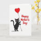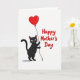 This card features a black, human-like cat standing on the left against a bright white background, with wide eyes, a small rosy nose, and fine white whiskers that give it a tender, friendly look ❤️. One paw holds a thin string attached to a shiny red heart-shaped balloon drifting up toward the top edge, like a quiet gesture of affection. On the right side, a celebratory message appears in thick, hand-drawn red lettering that echoes the balloon’s color. The layout feels balanced, with the cat looking inward toward the words as if sharing the moment with someone close. The open white space keeps everything airy and puts extra focus on the deep black fur and the rich red heart. A soft gray shadow sits under the cat, adding a touch of depth without crowding the scene 🌼. The balloon’s glossy highlight and the gentle curve of the string are clearly visible near the upper right area of the design.