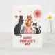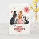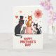 This greeting card shows five stylized cats arranged on a soft, pale background, with gentle details that suggest closeness and affection ❤️. In the center, an orange-striped cat with a red bow tie sits on a blush-pink round pedestal, holding out a small pink flower as if offering it to someone special. A tiny matching blossom decorates the pedestal, adding a sweet, romantic touch without crowding the scene. On the left stands a larger black cat in a tall hat and red bow tie, with a small grey tabby kitten tucked close at its side, their poses angled toward the center like they’re sharing the moment. On the right, a black-and-white cat in a red bow tie is paired with a tiny kitten, and their gentle lean inward reads like a warm family hug 🌼. Pink and red hearts float around the group, and a large stylized flower shape sits near the upper right corner to balance the layout. Along the bottom, a short Mother’s Day message appears in bold red lettering, centered beneath the pedestal and characters. The shading stays soft and smooth, with rosy pink accents and crisp red details standing out against the light background.