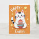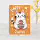 This greeting card features a plump, stylized white cat centered on a sunny orange background, gazing forward with wide eyes and softly rosy cheeks that feel like a friendly, affectionate hello. Thin dark stripes mark its forehead and tail, and its paws cradle a decorated oval egg close to its chest as if it’s being shared with someone special. The egg is patterned with bands of red, deep blue, and teal, topped with small dots, stripes, and zigzags in yellow and pale blue for a festive spring look 🌷. Small yellow blossoms are scattered across the orange field, adding a gentle garden feel that pairs nicely with the cat’s tender, welcoming pose. At the top, the word “HAPPY” appears in large white letters, easy to read against the warm background. Near the bottom, a second line of white cursive-style lettering completes the greeting, tucked neatly beneath the character. The overall artwork uses flat color shapes with minimal shading, and the orange backdrop is sprinkled with simple yellow flowers around the cat and egg 🐰.
