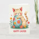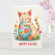 Designed with a sweet spring scene, the front features a cream-colored cat with soft caramel stripes and rosy cheeks hugging a large robin’s-egg-blue egg like a dear friend. The cat sits slightly right of center, eyes gently closed, with a curled striped tail that balances the layout and suggests a tender, contented moment. The egg is decorated with fuchsia and daffodil-yellow flowers, with small crimson and mint-green hearts scattered between the petals for a romantic touch 🌷. Along the bottom, a band of green grass stretches across the card, dotted with flowers that echo the egg’s colors and patterns. Soft shading and light highlights give the characters and decorations a rounded, cozy look without feeling heavy. The words “HAPPY EASTER” appear prominently near the top in a clear, easy-to-read font, set in a coordinating pastel tone that stands out against the light background 🐰. Tiny heart shapes in crimson and mint-green sit among the blossoms on the egg, while matching flowers peek up from the grass below.