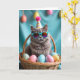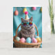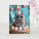 This design shows a fluffy gray tabby cat sitting upright in a rustic wicker basket, nestled among pastel Easter eggs, including one with small polka dots. A tiny striped party hat with a bright fuchsia pom‑pom tilts on its head, adding a friendly, flirty touch 🐰. The cat wears aqua-framed sunglasses with reflective lenses that shift from orange to deep magenta, giving it a cool, teasing look as if posing for a close friend. Soft, diffused light brings out the fur’s texture and the long white whiskers, making the scene feel cozy and intimate. A turquoise fabric drape hangs behind the basket, its gentle folds framing the cat like a simple stage. Near the top, a short holiday greeting appears in a light-colored font, centered and easy to spot against the cool background 🌷. In the distance, blurred coral, yellow, and pink spheres hover like soft decorations around the turquoise backdrop.
