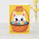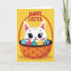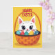 Designed with a cute, cartoon-style white cat peeking up from a large woven basket, this card feels sweet and friendly, like a little hello from someone close. The cat has big dark eyes with soft lashes, a tiny pink nose, and a faint blush on its cheeks that gives it a tender, affectionate look. Light gray stripes add gentle texture to its fur while keeping the character simple and bright. The basket is shaded in warm orange tones and is filled with decorated eggs in blue, red, yellow, and deep teal, covered in dots and wavy lines. Near the top, the words “HAPPY EASTER” sit above the illustration in deep red lettering, standing out clearly against the background. A sunny yellow backdrop surrounds everything, making the scene feel like a cheerful spring moment 🌷. The eggs cluster around the cat’s face as if they’re keeping it cozy, with the orange weave and colorful patterns forming a lively nest 🐰. The top text is centered, and the basket’s rim curves across the lower half while the patterned eggs fill the space around the cat’s head.
